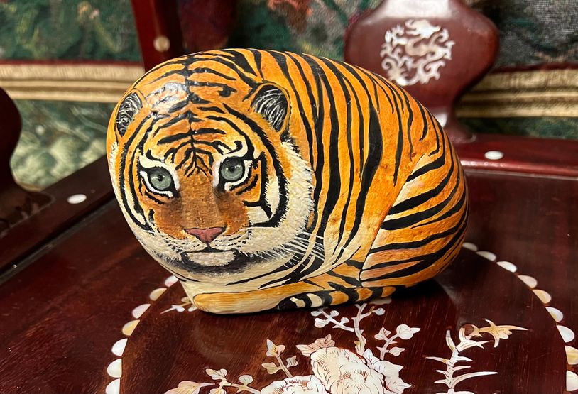 This is a lovely Tiger painted rock using acrylic paint varnished for long lasting durability and vivid colors. This fun Tiger painted rock is available for purchase. Please contact me for pricing.