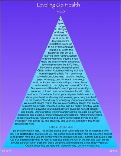 At the top of the triangle is Dr. Joe Dispenza's work and meditations. Of course if you know are drawn to other emotional/spiritual practices like EFT, body therapies, Devotional prayer, recognizing the Christ within, Automatic writing/psychography (spiritual journaling) getting help from your inner spiritual consciousness, hands on healing, psychotherapy, psychoneuroimmunology workbooks and etc. please continue with it. But, I still do highly recommend Dr. Joe Dispenza's works if you are open to it and have not obtain results with other methods. It's about your belief in allowing and knowing your body can heal in the most profound way by changing you focus and beliefs. It's our responses to stresses. Those are our signals. We are not taught this. In fact we are constantly taught to be reliant on outside resources to heal and be happy. Spiritual methods of healing can reveal how powerful your mind/body are given the correct thoughts and beliefs.